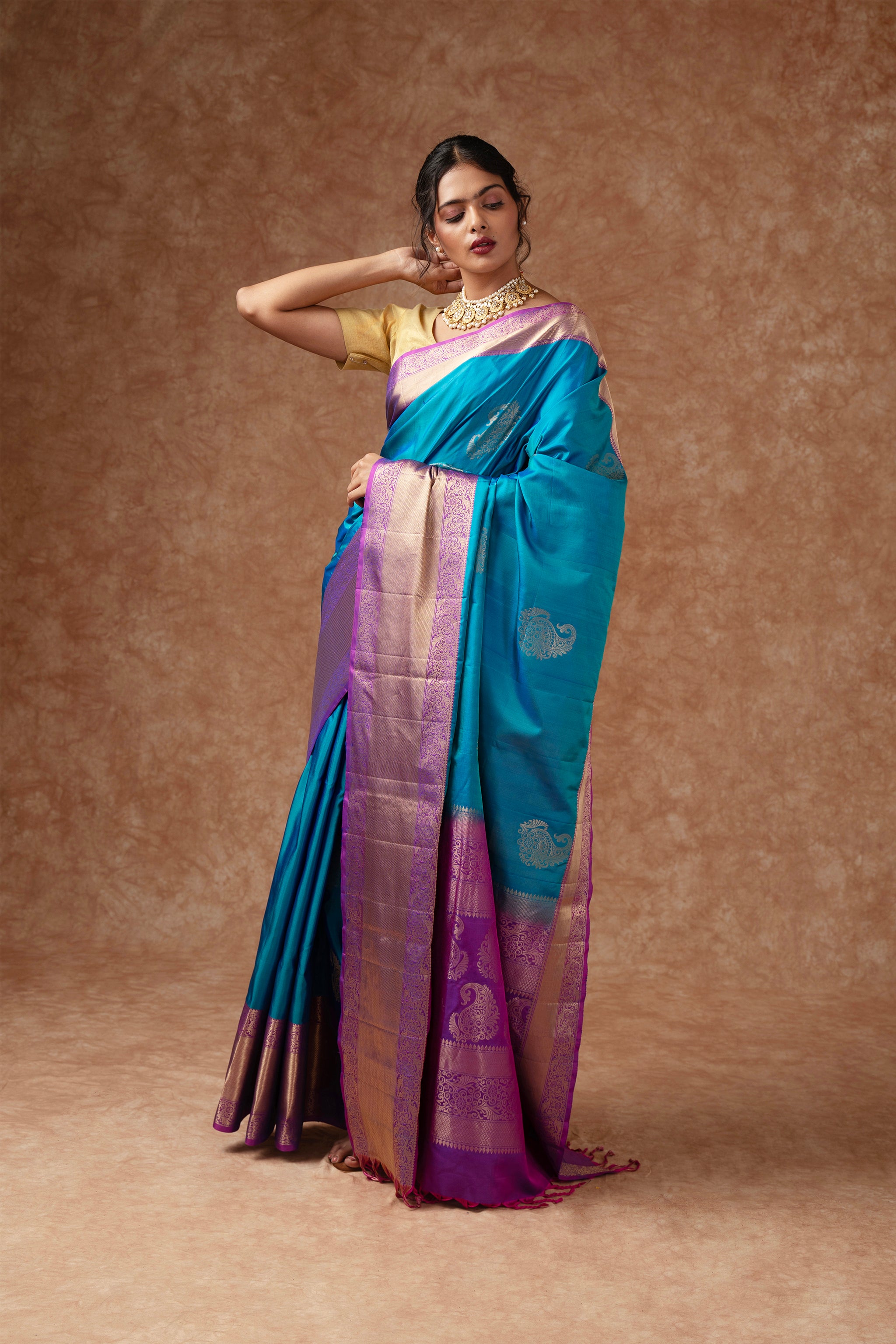 This exquisite handwoven pure silk saree showcases the revered Paithani weaving technique, a legacy craft from Maharashtra and North Karnataka. The vibrant sapphire silk body is adorned with intricate peacock and parrot motifs, iconic symbols of Paithani artistry that celebrate cultural heritage and elegance.