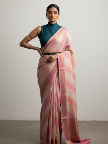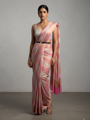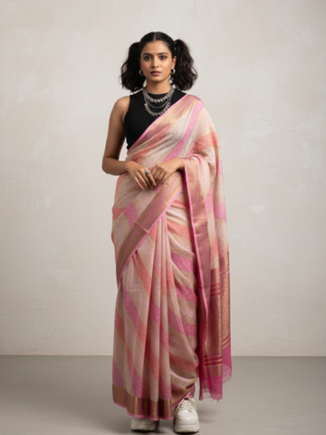 Mysore Crepe Silk Striped Saree in Rose Quartz & Gold