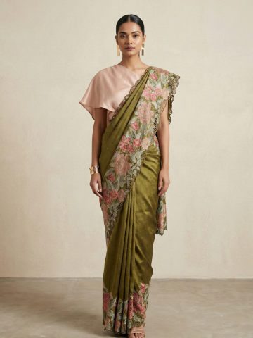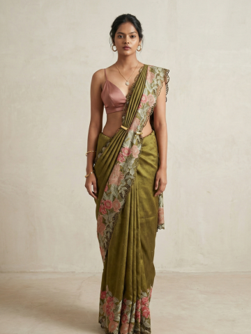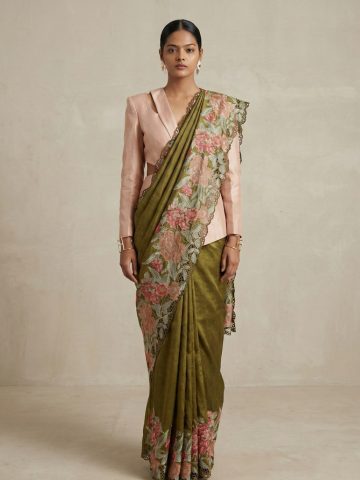 Tussar Silk Embroidered Cut-work Saree in Antique Olive