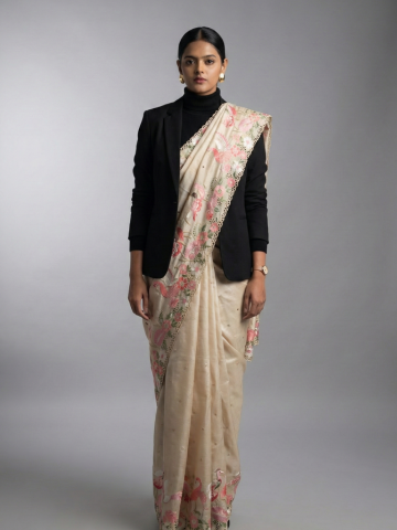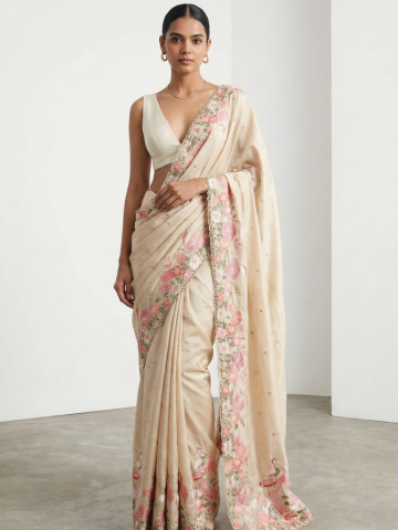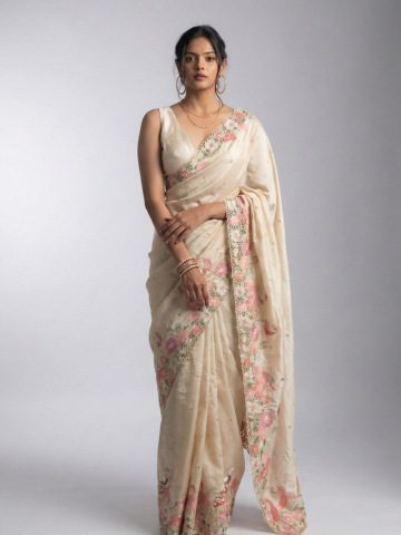 Tussar Silk Embroidered Cut-work Saree in Porcelain Ivory