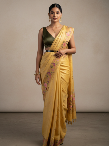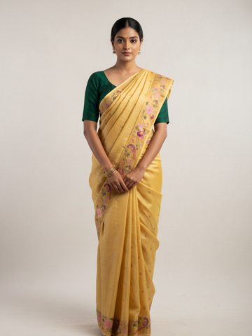 Tussar Silk Embroidered Saree in Antique Marigold